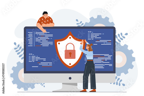 Wall mural antivirus software concept. man and woman near computer screen with code. programmers and it special