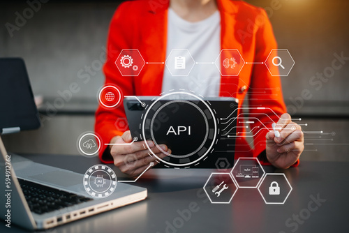 The watermark will not be included on Wall mural.: Api application programming interface, woman using laptop, tablet and smartphone with virtual screen