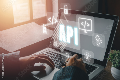 Wall mural api - application programming interface, woman using laptop computer with vr screen api icon on offi - Wall murals Wall mural api - application programming interface, woman using laptop computer with vr screen api icon on offi - Wall murals
