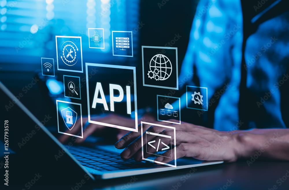 The watermark will not be included on Wall mural.: Api application programming interface concept - a programmer types on a laptop, interacting with digi