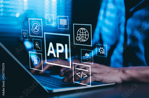 Wall mural : Api application programming interface concept - a programmer types on a laptop, interacting with digi