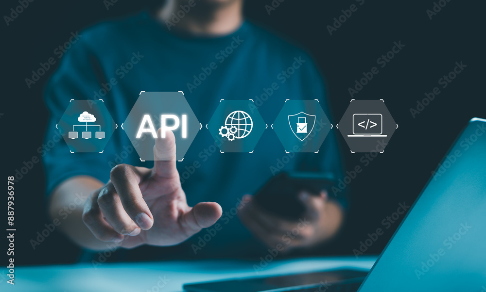 Wall mural api concept. application programming interface, person with api related technology icons, cloud comp