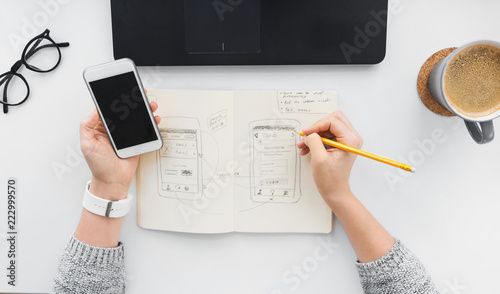 Wall mural : App design, technology and business concept - web designer or developer with smartphone working on u