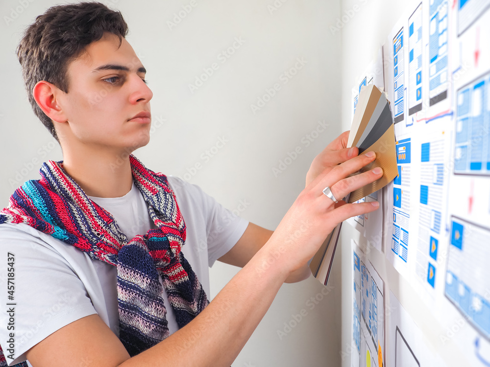 Wall mural app design concept. designer chooses a color for mobile app. he keeps a color palette. phone app pro