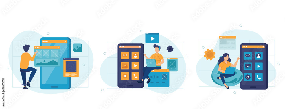 Wall mural app development concept set. developers write code, testing, create page layout. people isolated sce - Wall murals Wall mural app development concept set. developers write code, testing, create page layout. people isolated sce - Wall murals