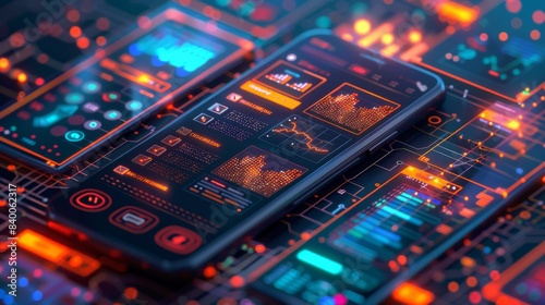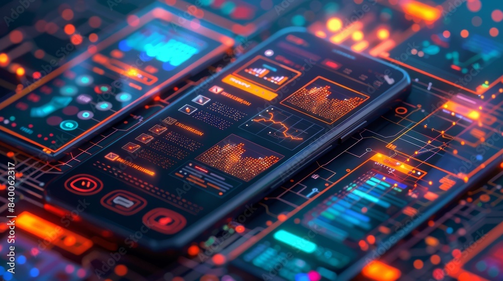 The watermark will not be included on Wall mural.: App with business graph and analytics data on isometric phone - trend analysis and the coding process