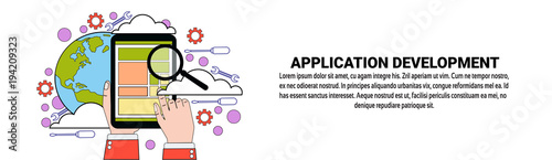 Wall mural application development web design concept horizontal banner with copy space flat vector illustratio