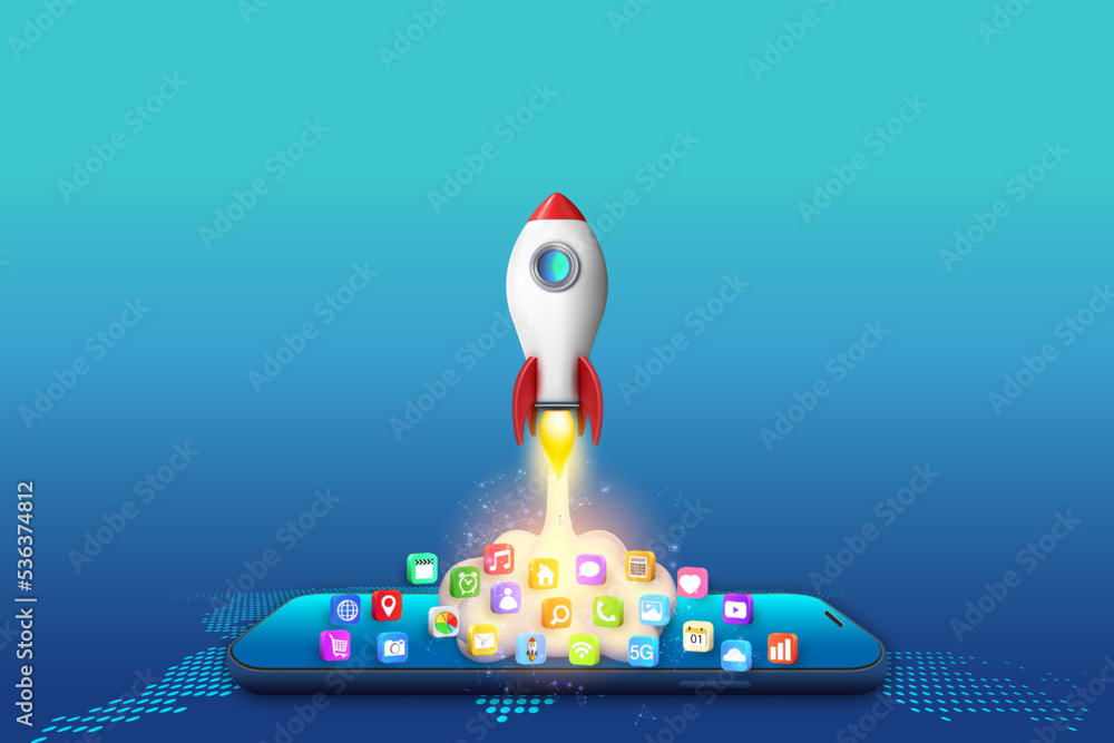Wall mural application on mobile, rocket startup on mobile, smartphone with application icons isolated on globa