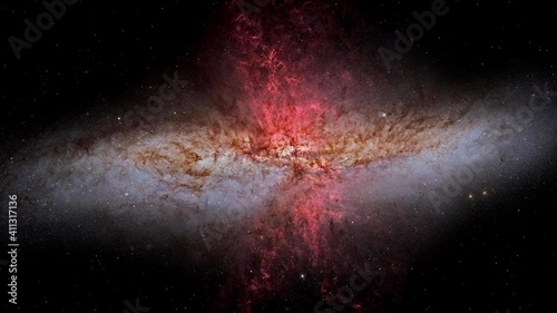 Wall mural : Approaching to spectacular galaxy rotating in outer space with jet explosion red dust and animated s