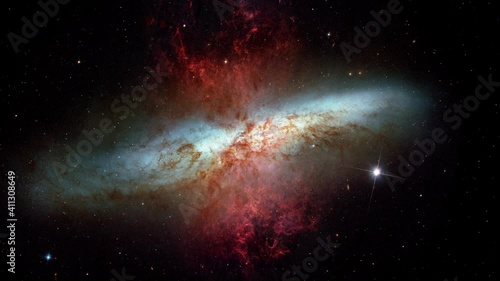 Wall mural : Approaching to spectacular galaxy rotating in outer space with jet explosion red dust and animated s