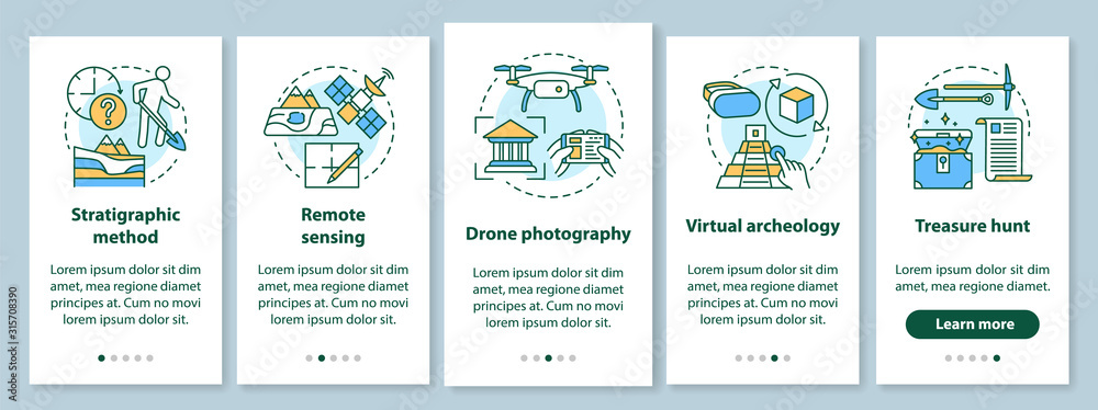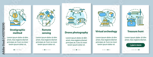 Wall mural : Archeology methods onboarding mobile app page screen with linear concepts - study of terrain, treasur