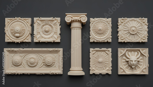 The watermark will not be included on Wall mural.: Architectural elements including columns and reliefs in classical style on a gray background