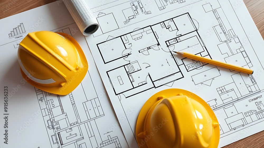 Wall mural architectural project, blueprint floor plan unfurled across a tablescape, accompanied by a yellow he - Wall murals Wall mural architectural project, blueprint floor plan unfurled across a tablescape, accompanied by a yellow he - Wall murals