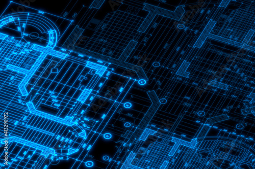 Wall mural architecture blueprint on digital lcd display with reflection. abstract technology background. 3d re - Wall murals Wall mural architecture blueprint on digital lcd display with reflection. abstract technology background. 3d re - Wall murals