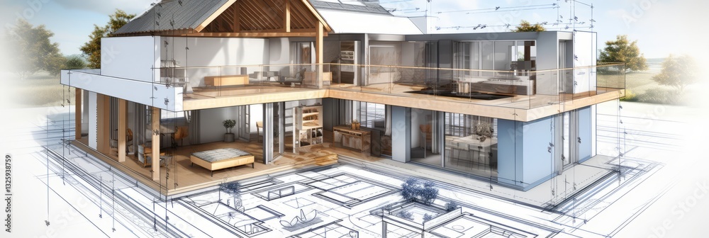 Wall mural architecture of a 3d model house project with blueprint