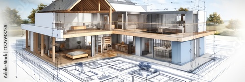 Wall mural architecture of a 3d model house project with blueprint - Wall murals Wall mural architecture of a 3d model house project with blueprint - Wall murals