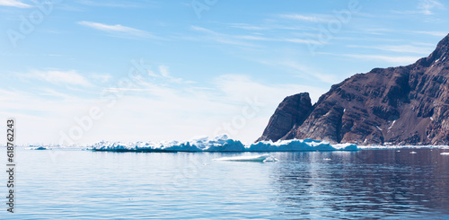 Wall mural arctic landscape of greenland in summer. beautiful view of mountains with snowy peaks and iceberg
