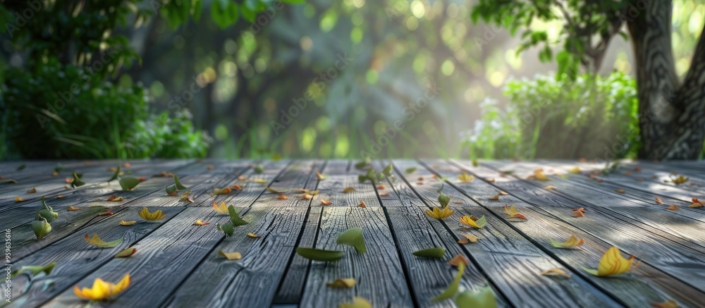 The watermark will not be included on Wall mural.: Arrange the leaves on the wooden floor - copy space image - place for adding text and design