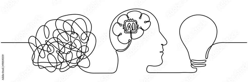 The watermark will not be included on Wall mural.: Artificial brain intelligence technology with chaos thoughts and light bulb continuous line drawn - p