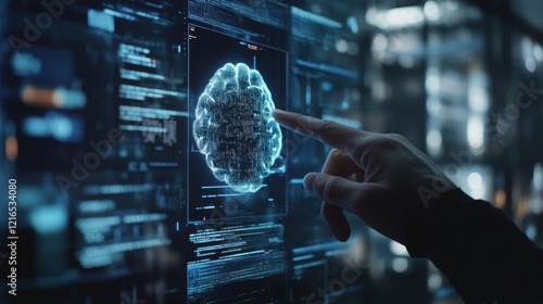 Wall mural artificial intelligence and medical science concept, hand interacting with digital brain hologram on - Wall murals Wall mural artificial intelligence and medical science concept, hand interacting with digital brain hologram on - Wall murals