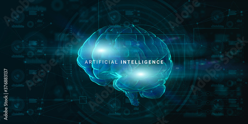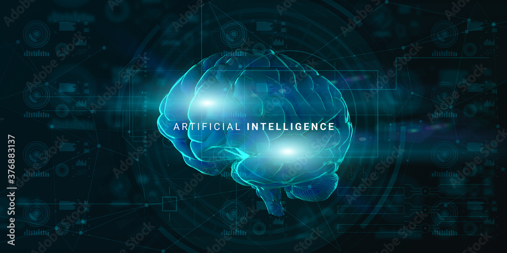 Wall mural artificial intelligence concept. glowing digital brain projection over abstract hud background