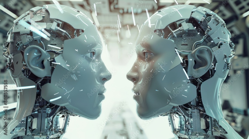 Wall mural artificial intelligence concept: neural network connection between two heads - Wall murals Wall mural artificial intelligence concept: neural network connection between two heads - Wall murals