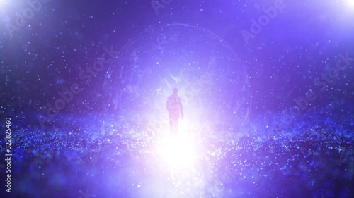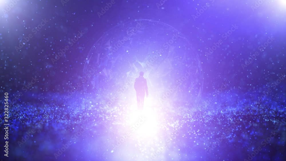 Wall mural artificial intelligence network with men walking towards shiny light.