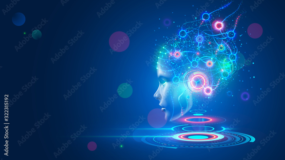 Wall mural artificial intelligence. ai head with neural network brain hanging over virtual digital podium. wise - Wall murals Wall mural artificial intelligence. ai head with neural network brain hanging over virtual digital podium. wise - Wall murals