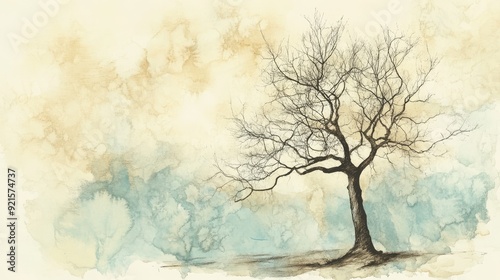 The watermark will not be included on Wall mural.: Artistic abstract line drawing of a tree, with a muted watercolor background suitable for text addit