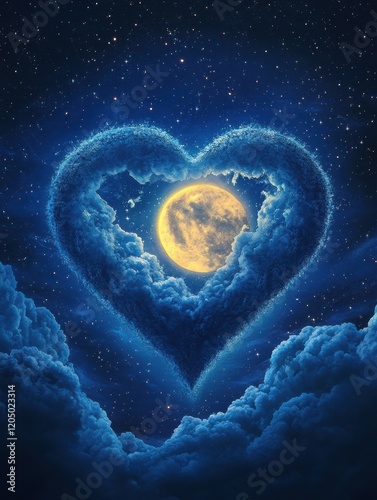 Wall mural artistic heart shape with moon and stars in a dreamy night sky, mystical illustration