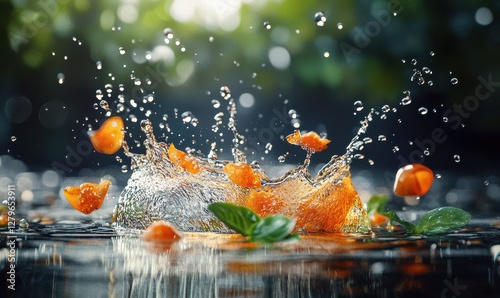 Wall mural artistic splash of clear water droplets captured mid-air, dynamic reflections and sharp lighting cre