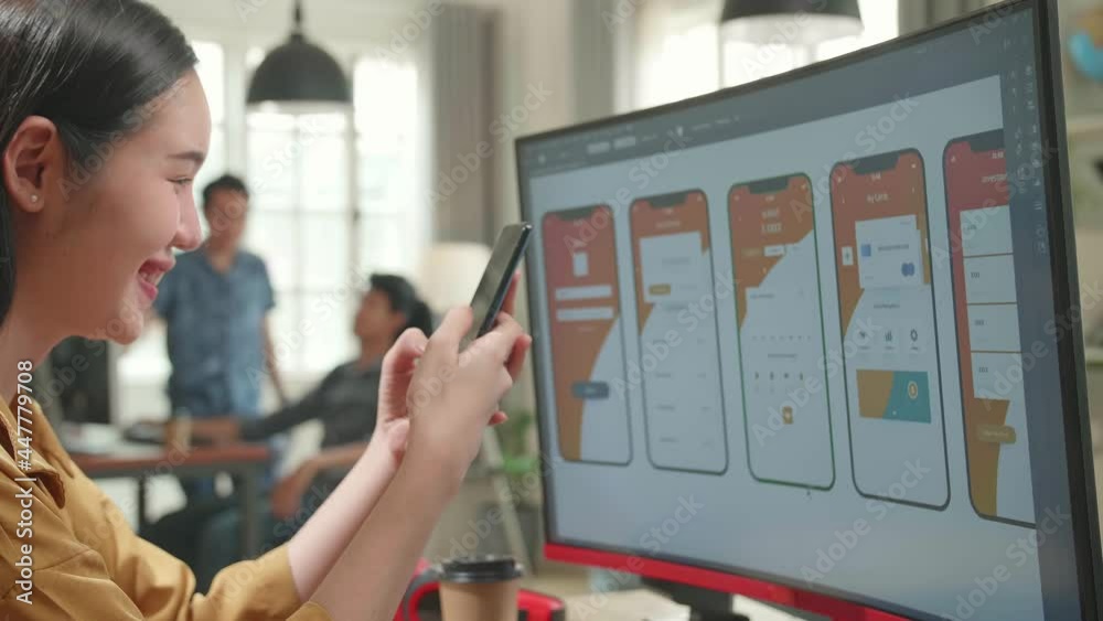 Wall mural asian female mobile application developer works and using mobile phone with graphics on her personal - Wall murals Wall mural asian female mobile application developer works and using mobile phone with graphics on her personal - Wall murals
