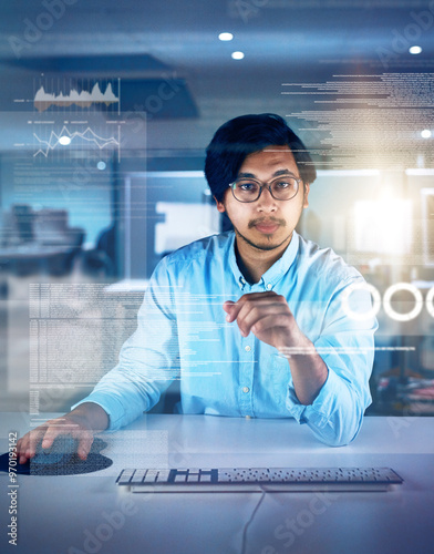 Wall mural asian man, data scientist and portrait with overlay, code or innovation in web research. computer en