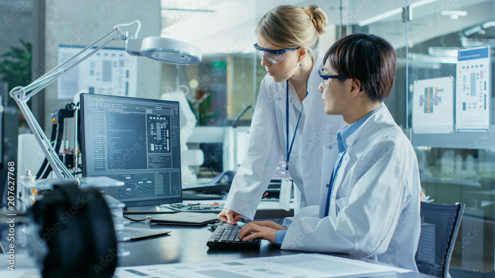 Wall mural asian scientist sitting at his desk consults senior engineer about sophisticated coding and programm - Wall murals Wall mural asian scientist sitting at his desk consults senior engineer about sophisticated coding and programm - Wall murals