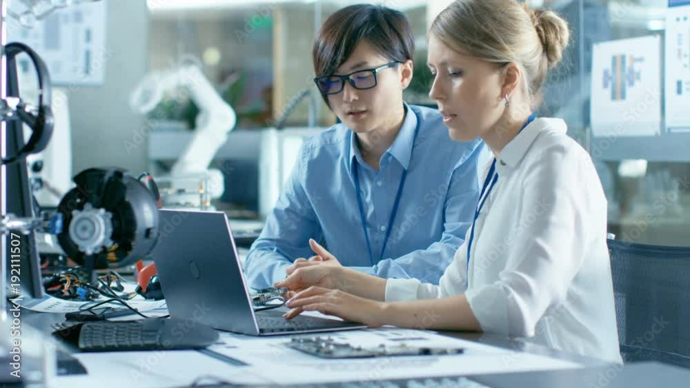 Wall mural asian scientist sitting at his desk consults senior engineer about sophisticated coding and programm - Wall murals Wall mural asian scientist sitting at his desk consults senior engineer about sophisticated coding and programm - Wall murals