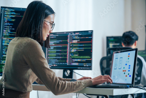 Wall mural asian software developers working on multiple screens displaying code and application diagrams in a