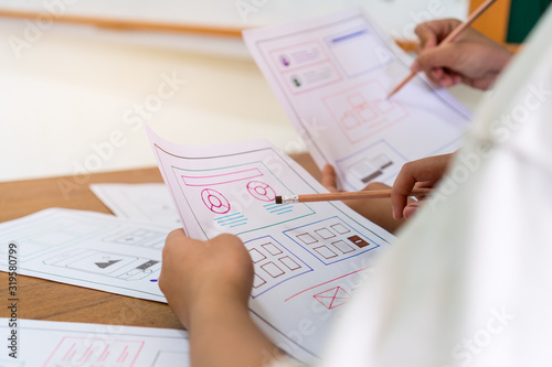 Wall mural : Asian startup web app designer team creating user experience ux on smartphone layout to design appli