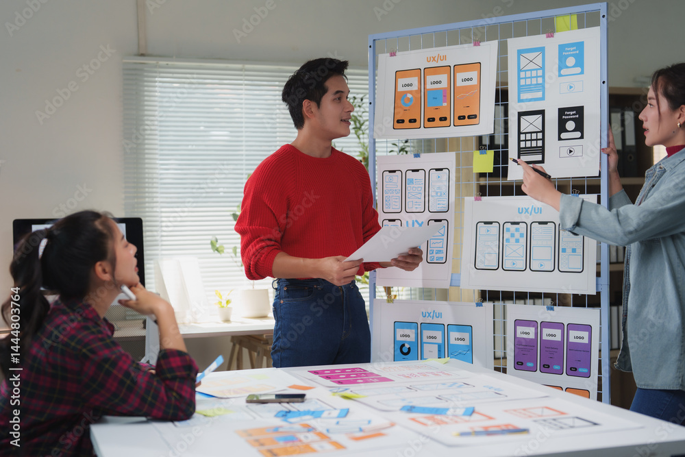 Wall mural : Asian team of uiux web designers discussing mobile application design on meeting table in office, cr