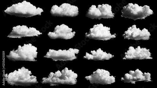 The watermark will not be included on Wall mural.: Assorted fluffy white clouds against black background in various shapes and sizes