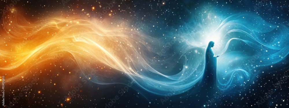 The watermark will not be included on Wall mural.: Assumption of mary in a dynamic, multi-dimensional space with swirling stars and celestial elements