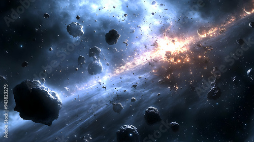 Wall mural asteroids and a bright light are visible in a deep space. - Wall murals Wall mural asteroids and a bright light are visible in a deep space. - Wall murals