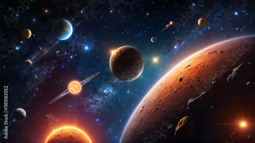 Asteroids soaring through the cosmos, gracefully passing by vibrant planets adorned with intricate d