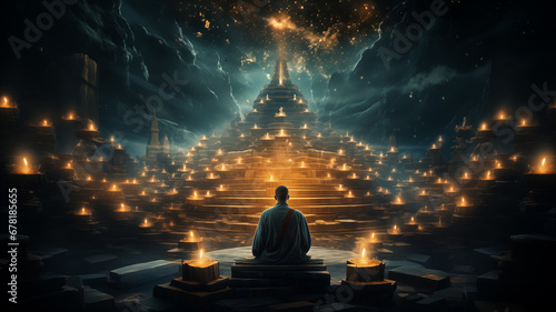 The watermark will not be included on Wall mural.: Astral yoga silhouette of human in cosmic space meditate - back view man practicing transcendental sp