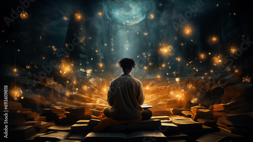 The watermark will not be included on Wall mural.: Astral yoga silhouette of human in cosmic space meditate - back view man practicing transcendental sp