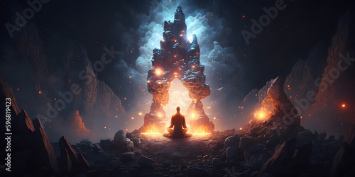 The watermark will not be included on Wall mural.: Astral yoga silhouette of human in cosmic space meditate - practicing transcendental spiritual medita
