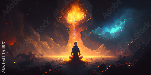 The watermark will not be included on Wall mural.: Astral yoga silhouette of human in cosmic space meditate - practicing transcendental spiritual medita
