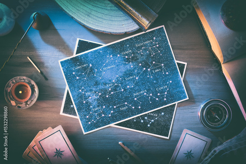 The watermark will not be included on Wall mural.: Astrological background of study and forecast with maps on table