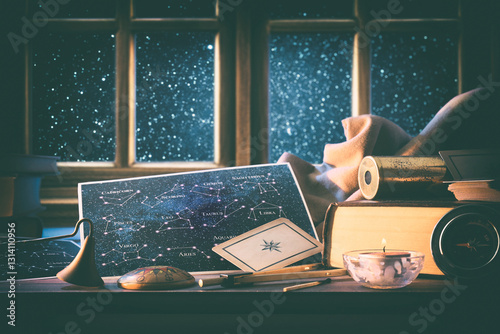 The watermark will not be included on Wall mural.: Astrological background with vintage objects and window with universe