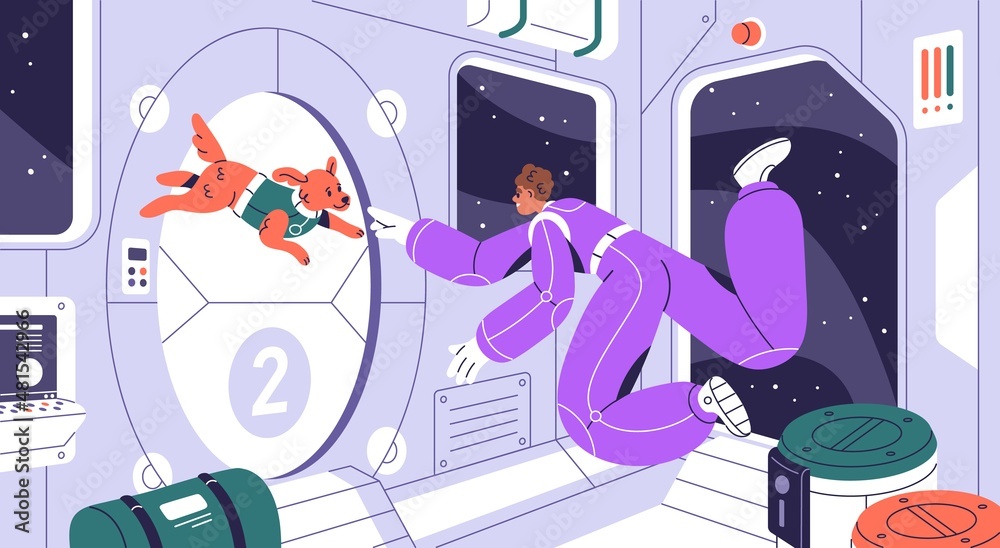 Wall mural astronaut and dog fly inside spaceship cabin during space flight. cosmonaut and puppy floating in co - Wall murals Wall mural astronaut and dog fly inside spaceship cabin during space flight. cosmonaut and puppy floating in co - Wall murals