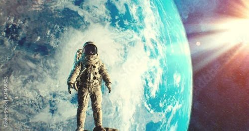 Wall mural astronaut armstrong standing on moon surface in space with earth and sun on background - Wall murals Wall mural astronaut armstrong standing on moon surface in space with earth and sun on background - Wall murals